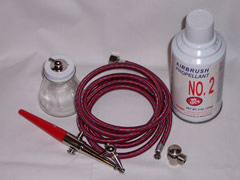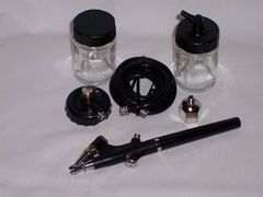 For use with propellant or air compressor. Includes: airbrush, color bottle with adapter, color bottle with plastic cap, air hose with couplings, 1/4'' airhose adapter for attaching to compressor, wrench and valve for propellant can.